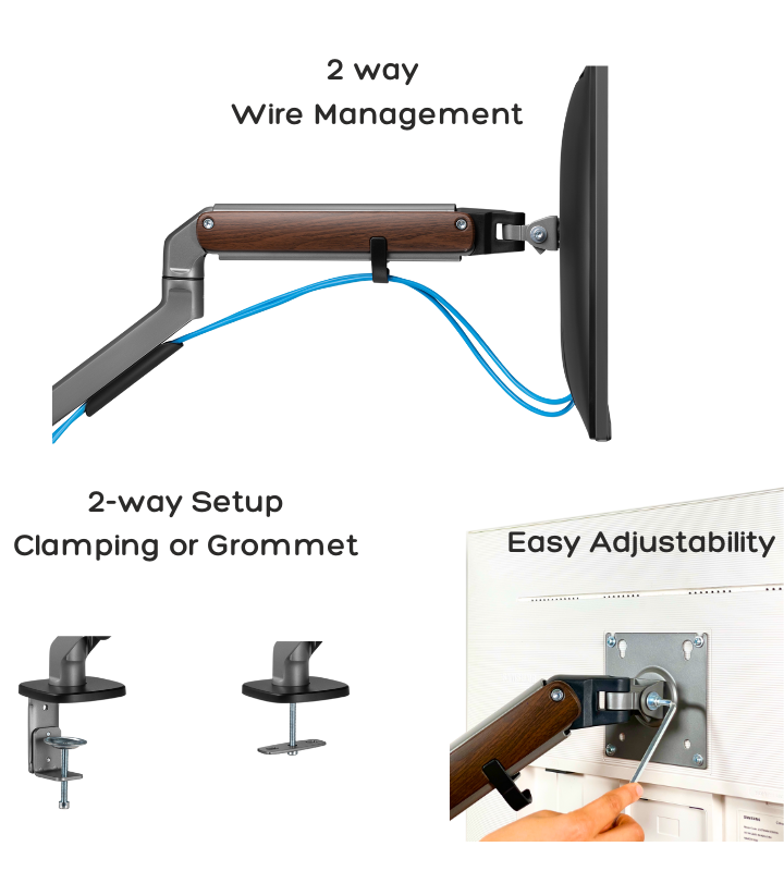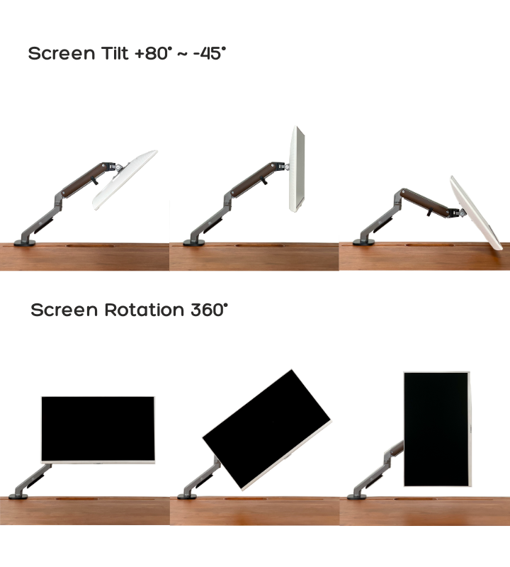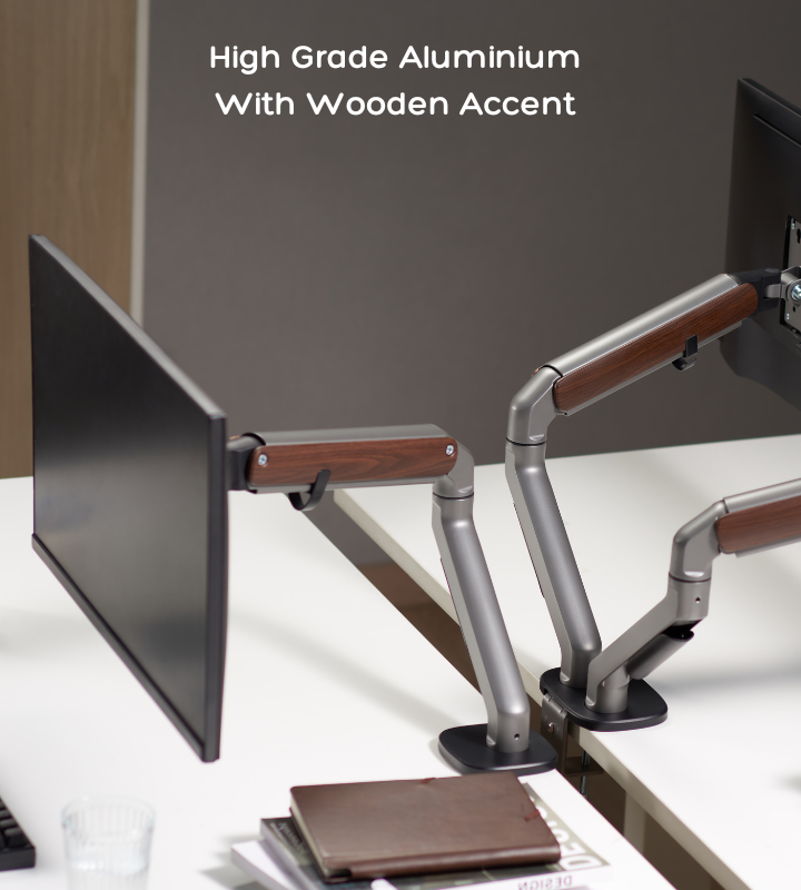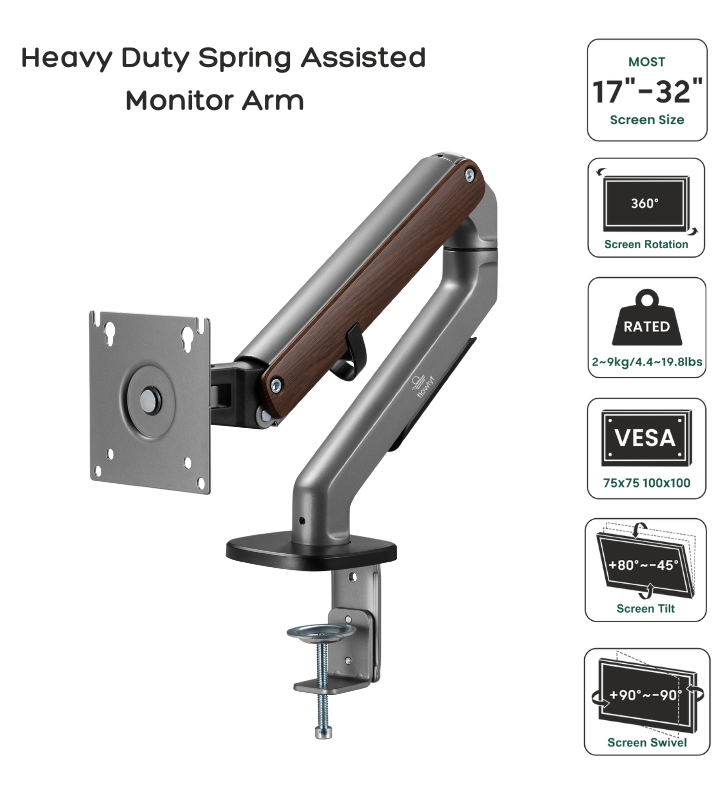 - Beautiful Design made with High Quality Material. The monitor arm is made with elegant die casting aluminum with aesthetically pleasing wooden accent. Integrated with innovative counterbalance technology. It can free up space on your desk and easily move your monitor into the best ergonomic position. Height adjustable arm moves up, down, forward and back with just a touch. With weight capacity of 9kg, this desk mount features 360° monitor rotation, 125° tilt, 180°swivel.