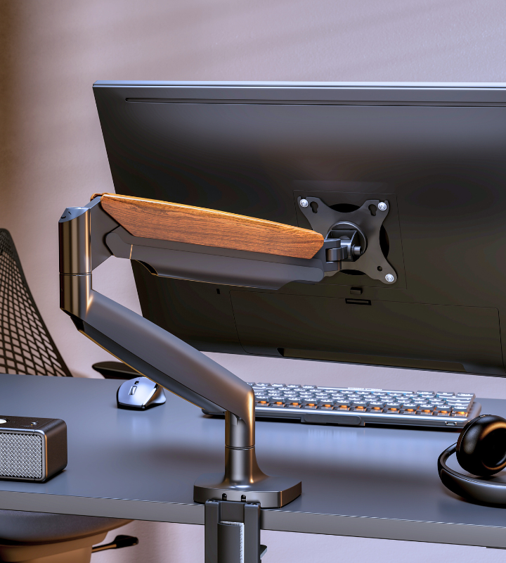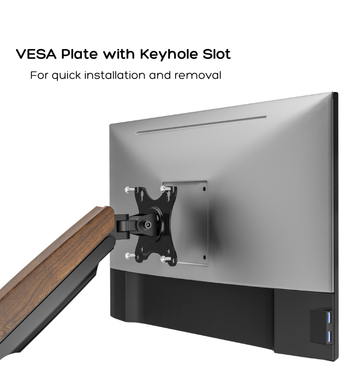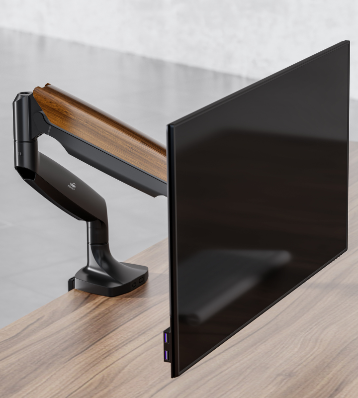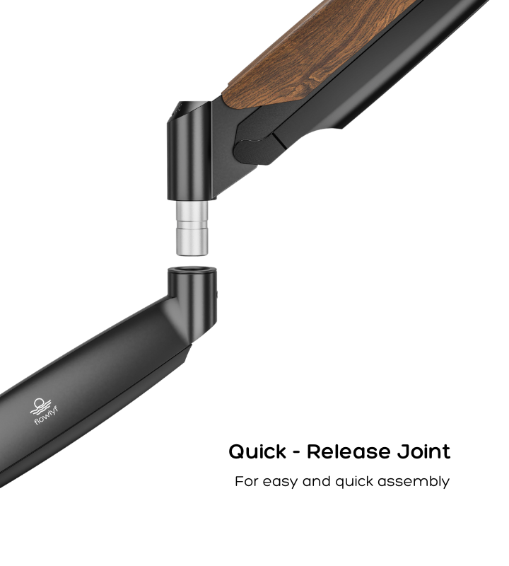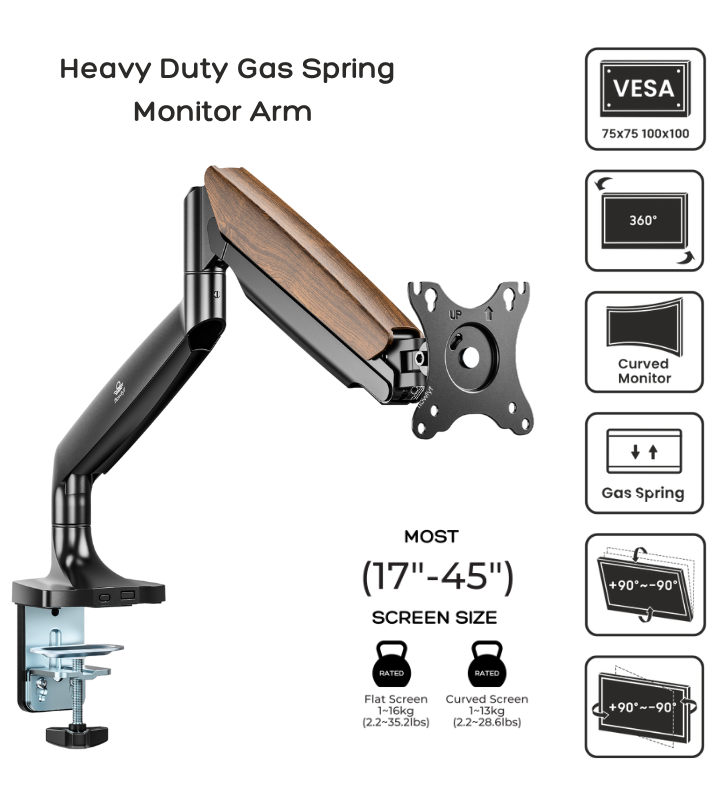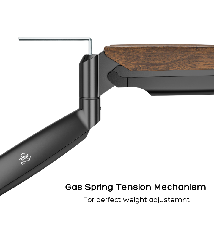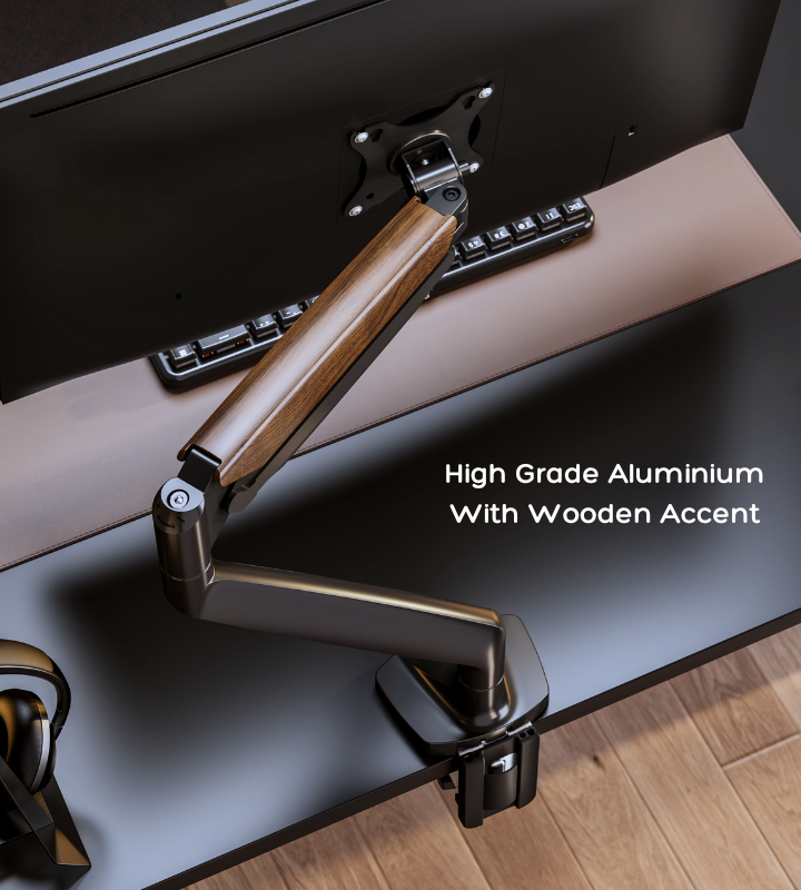 - Beautiful Design made with High Quality Material - The Flowlyf Heavy Duty Premium Monitor Arm is made with solid metal, elegant die casting aluminium with aesthetically pleasing wooden accent. And integrated with innovative counterbalance technology. It can efficiently free up space on your desk and easily move your LCD monitor into the best ergonomic position. Height adjustable arm moves up, down, forward and back with just a touch. With weight capacity of 16 kg.
