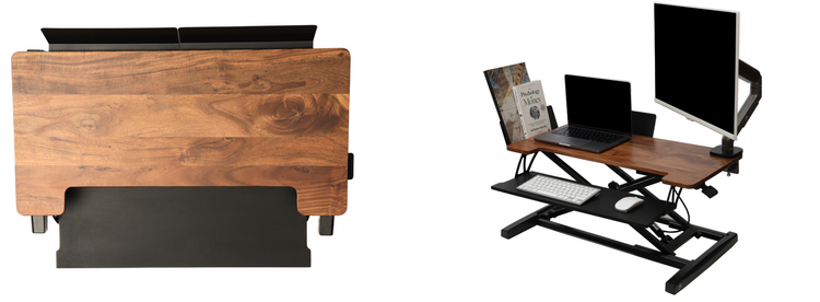 - [HIGH QUALITY MATERIAL WITH CLEAN DESIGN] The worksurface of the Flowlyf standing desk converter is made with SOLID ACACIA WOOD with rounded edges in the corner to give you a more relaxed support for comfort working. It comes with a UTILITY TRAY. The height adjustable gas spring mechanism is tested for 10000 cycles. The metallic frame with powder costing makes it a ultra-premium product.